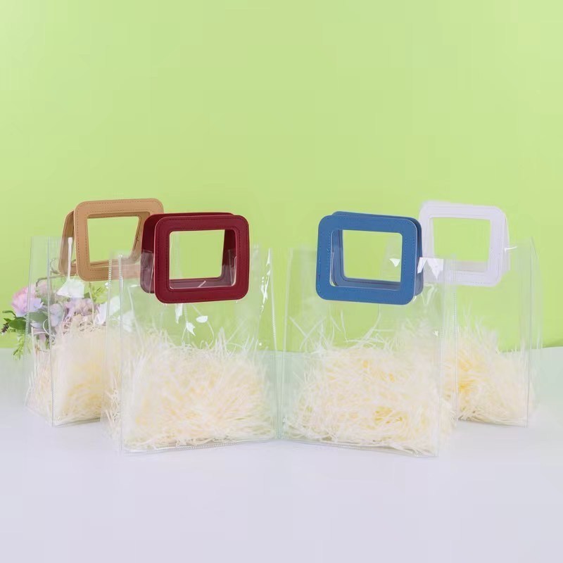 맞춤형 로고 재사용성 방수성 PVC 맑은 투명한 토테 가방 선물 가방 포장 가죽 손잡이 있는 토테 가방
